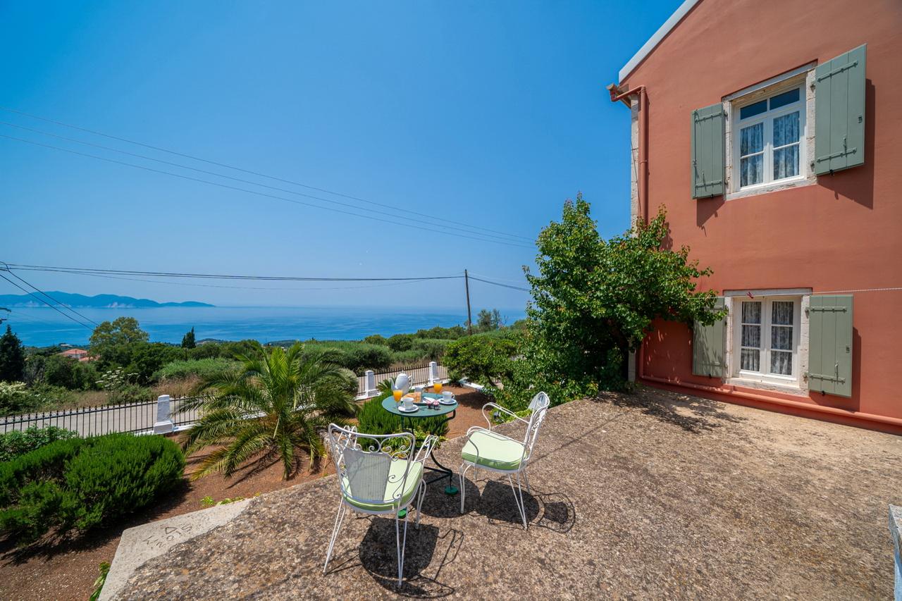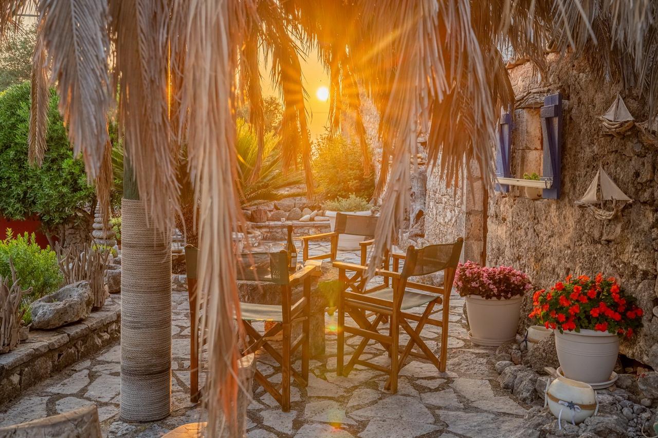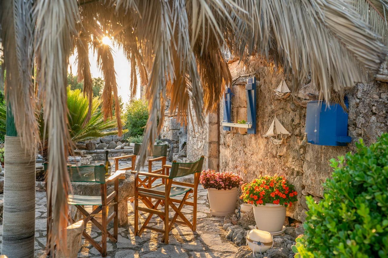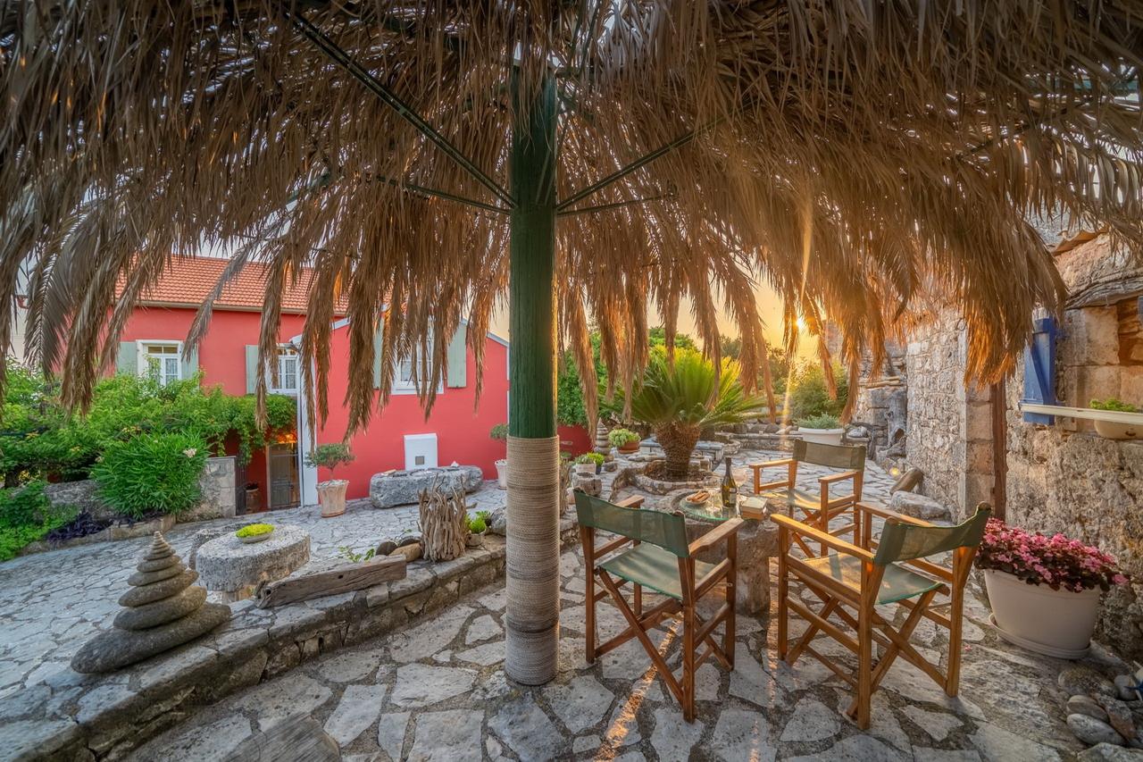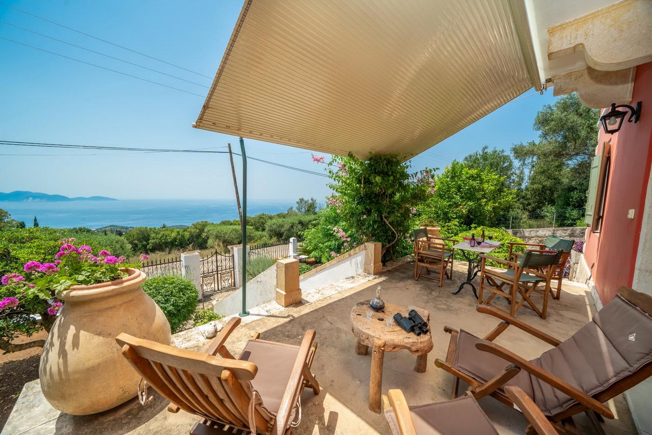 The beautiful views across the green hill-side towards the Ionian Sea on the front side and the grounds at the rear of the property contain ruins which has imaginatively utilised and crafted to create shaded terraces. His imaginative use of natural materials, stone, wood and old found objects, has resulted in an harmonious setting providing visual satisfaction wherever one cares to look. Lush garden-beds line stone and pebble pathways which lead to the swimming pool with its outdoor shower and a barbecue. All of this is beautifully lit at night to create the most idyllic of nocturnal settings.