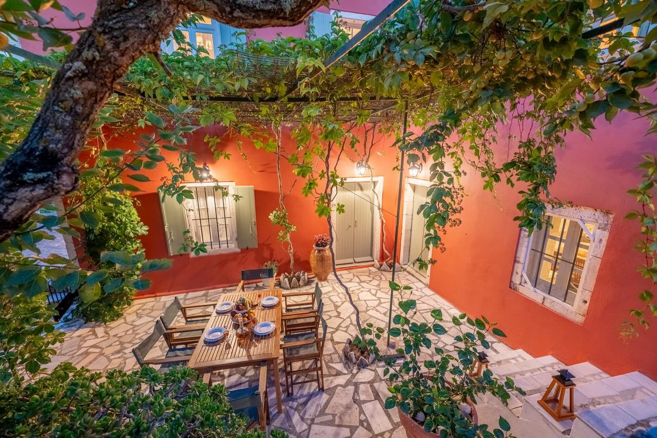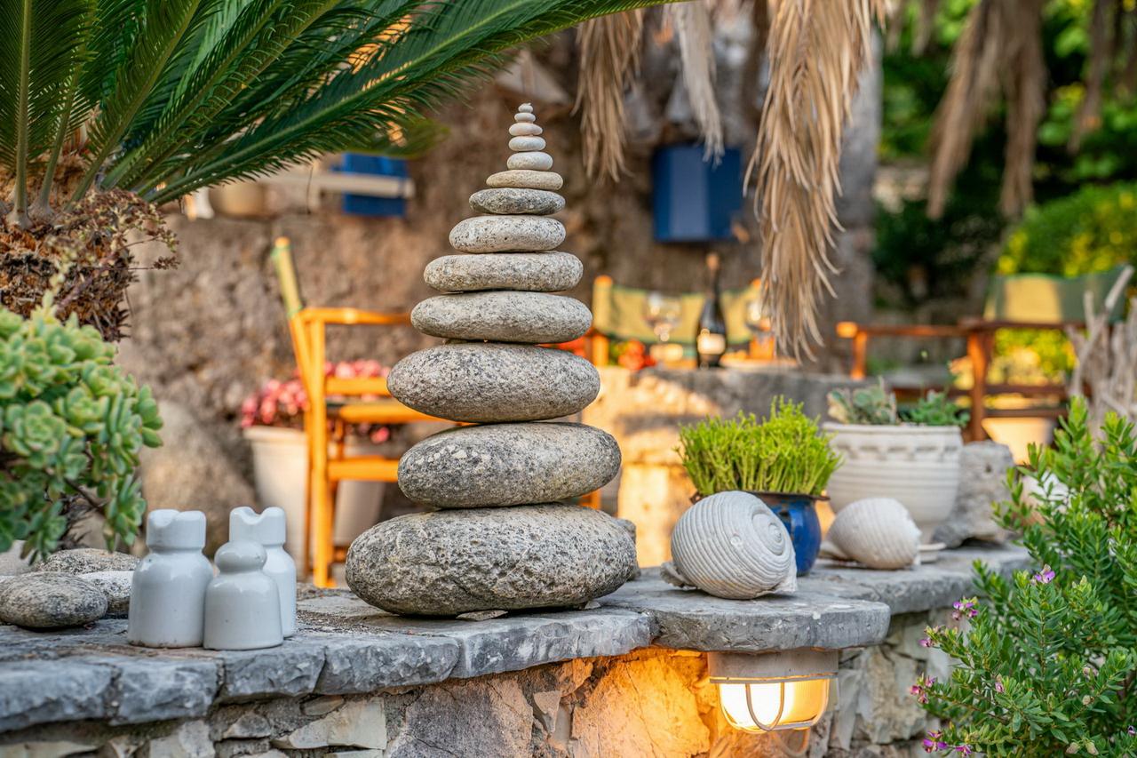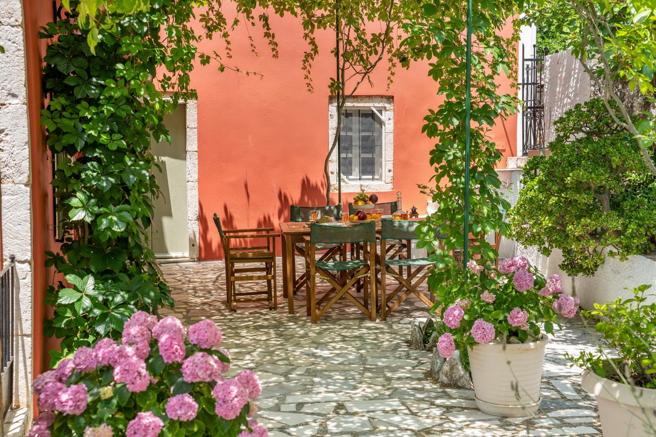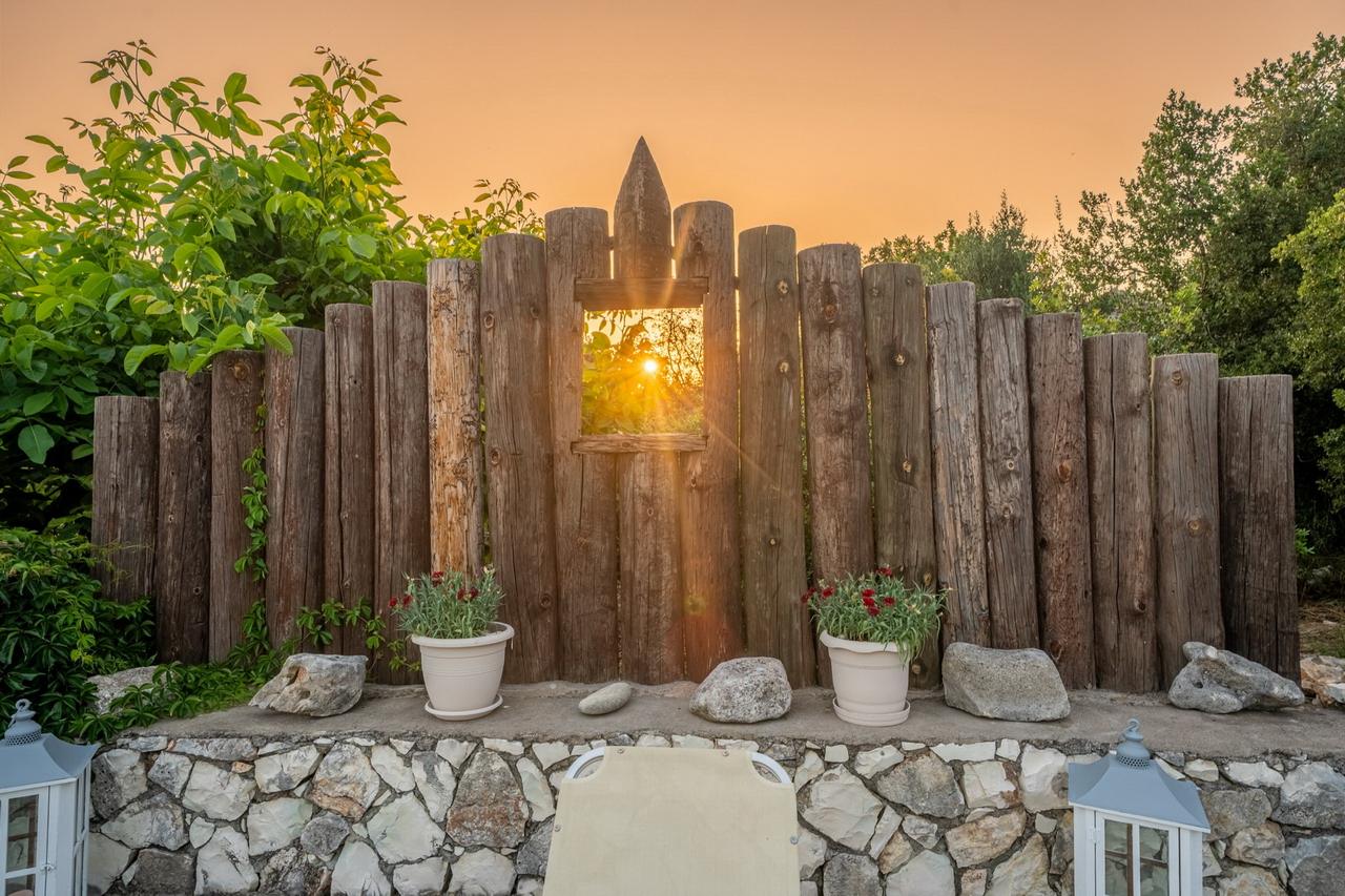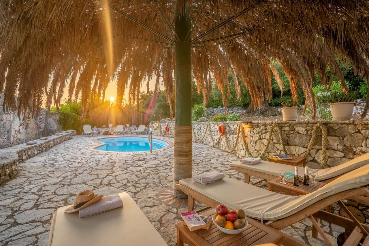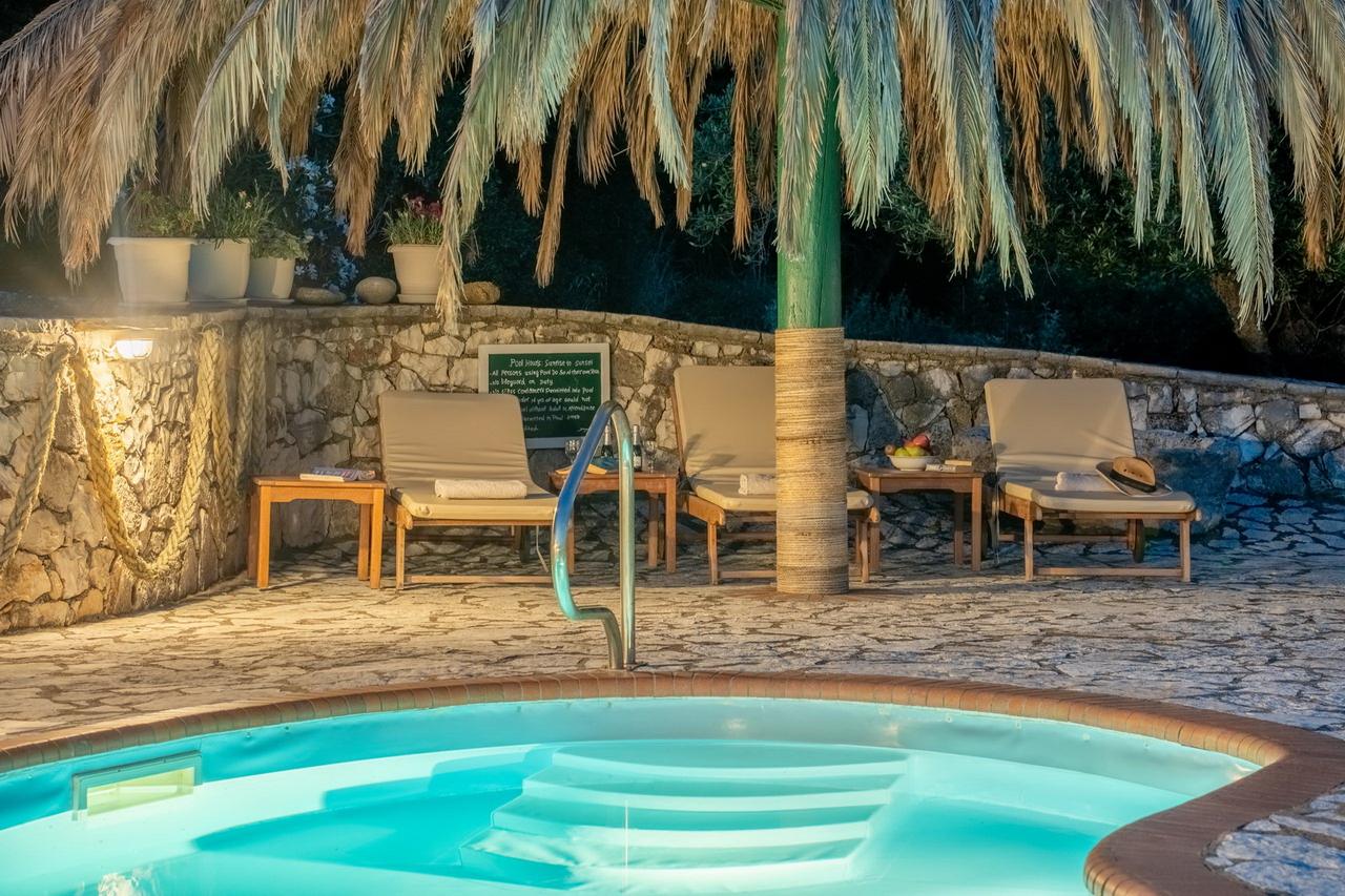 The beautiful views across the green hill-side towards the Ionian Sea on the front side and the grounds at the rear of the property contain ruins which has imaginatively utilised and crafted to create shaded terraces. His imaginative use of natural materials, stone, wood and old found objects, has resulted in an harmonious setting providing visual satisfaction wherever one cares to look. Lush garden-beds line stone and pebble pathways which lead to the swimming pool with its outdoor shower and a barbecue. All of this is beautifully lit at night to create the most idyllic of nocturnal settings.